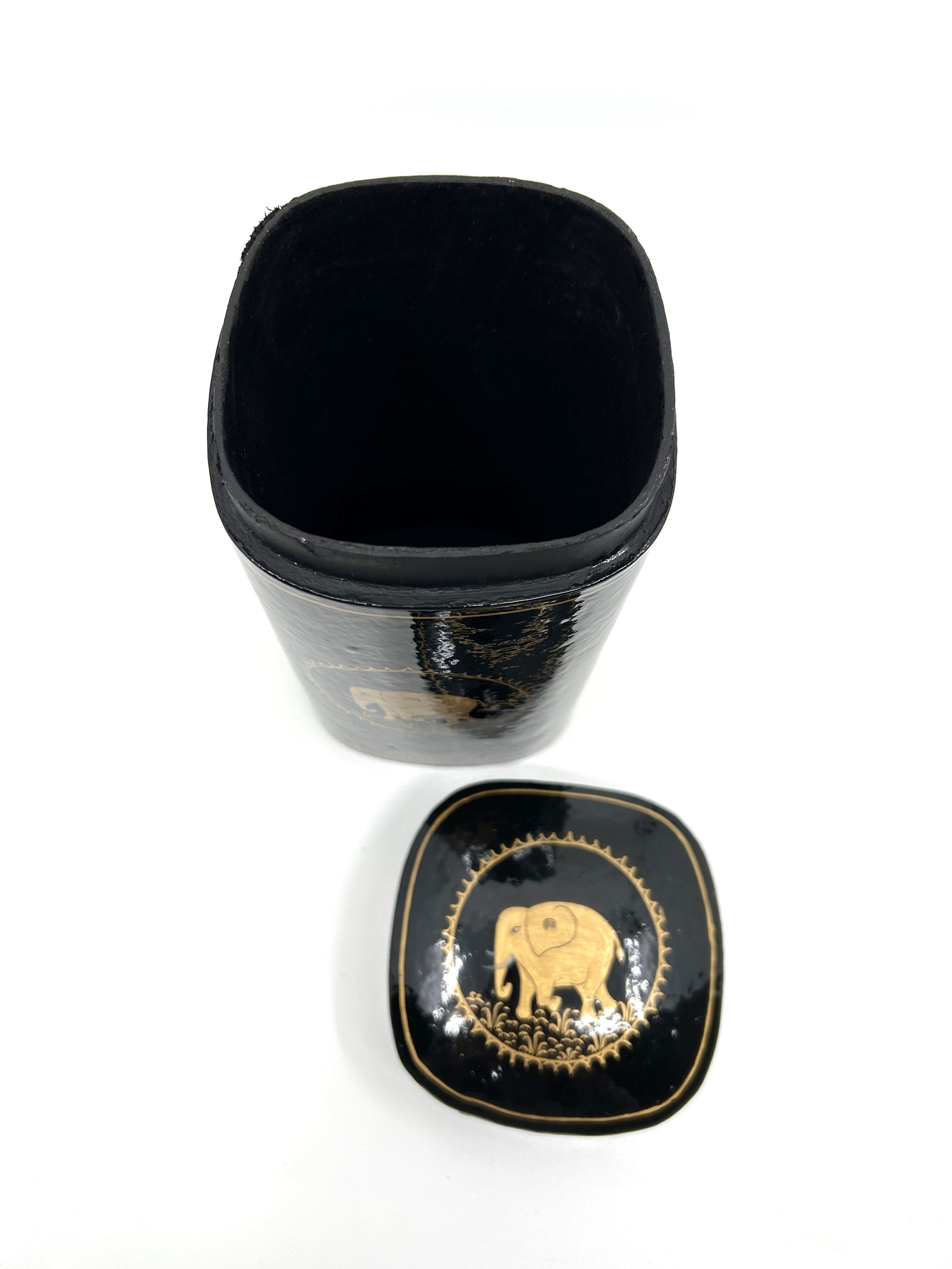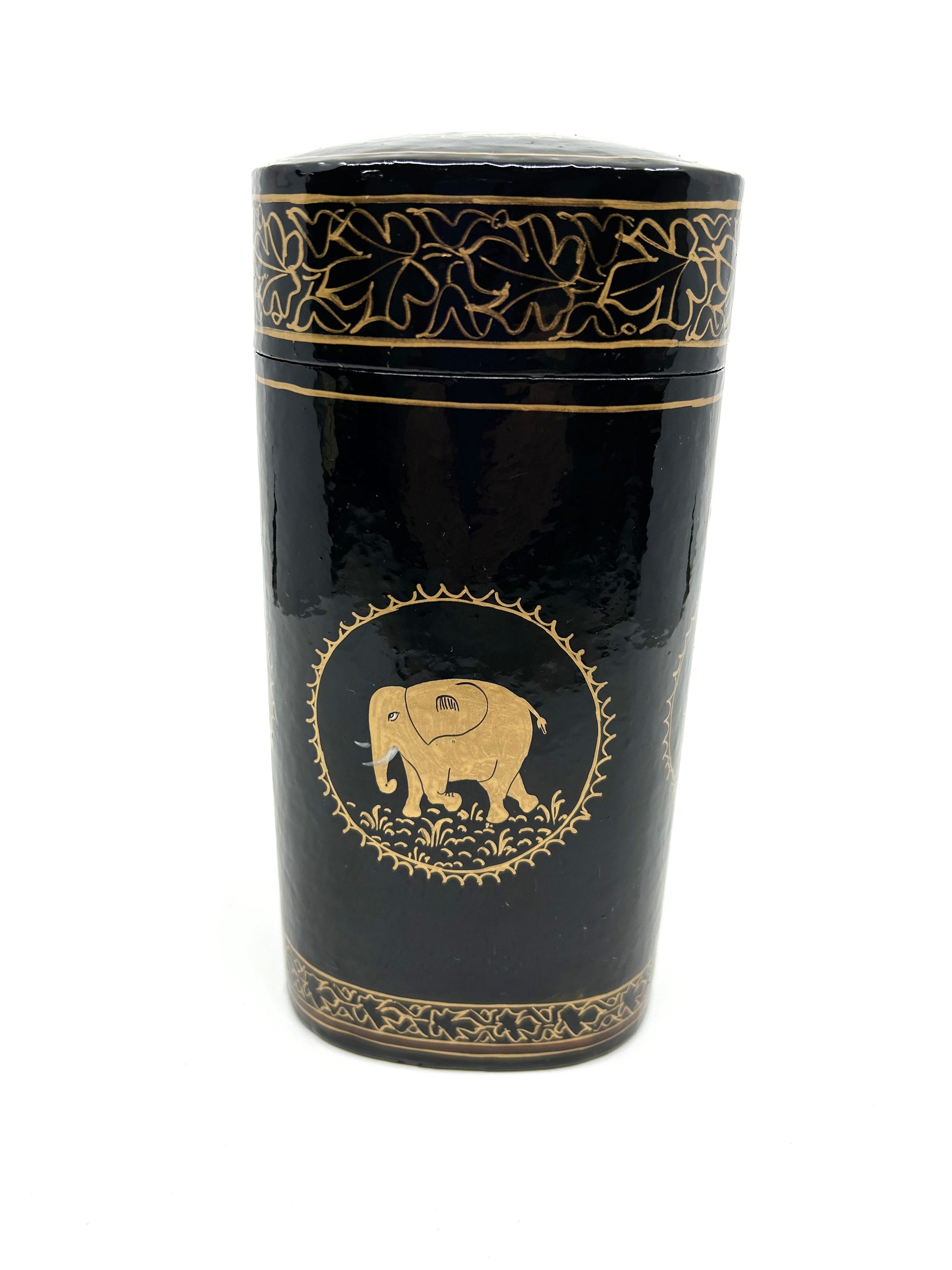Black and Gold Papier-Mâché Lacquer Tall Décor Box w/Elephant Motif