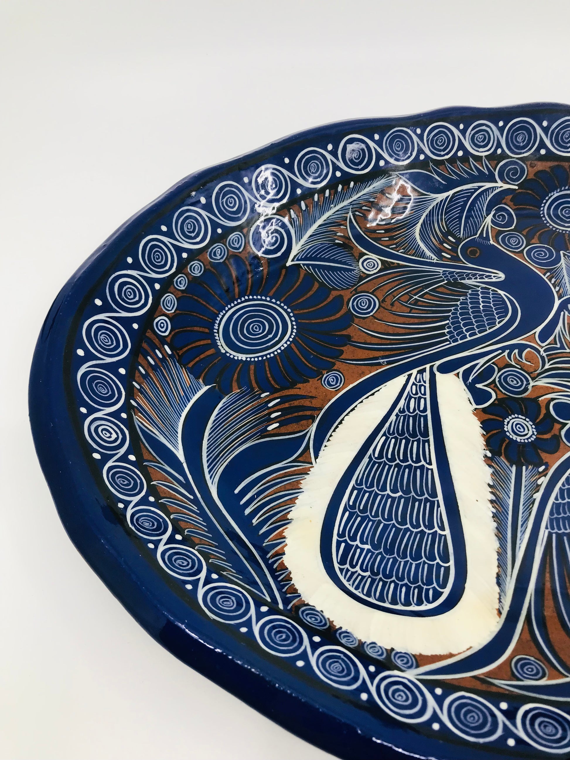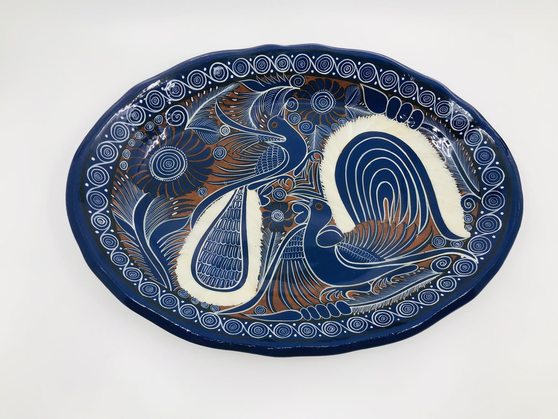 Cobalt Blue and White Mexican Talavera Painted Birds Redware Platter