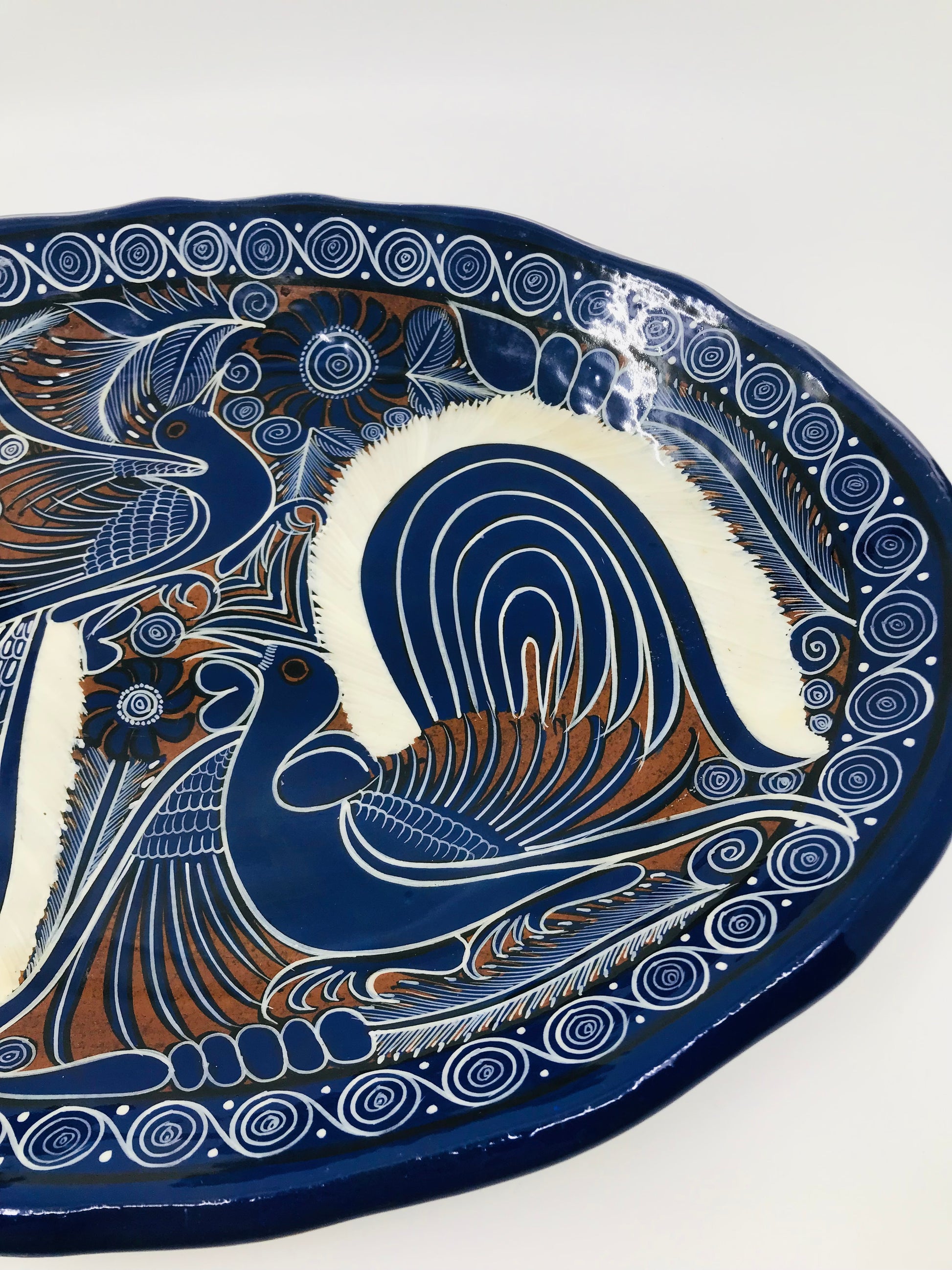 This cobalt blue Mexican Talavera redware platter with birds is really stunning. The blue and white colors are brightly displayed on this large platter. Back of the platter shows the natural redware the platter is made of.