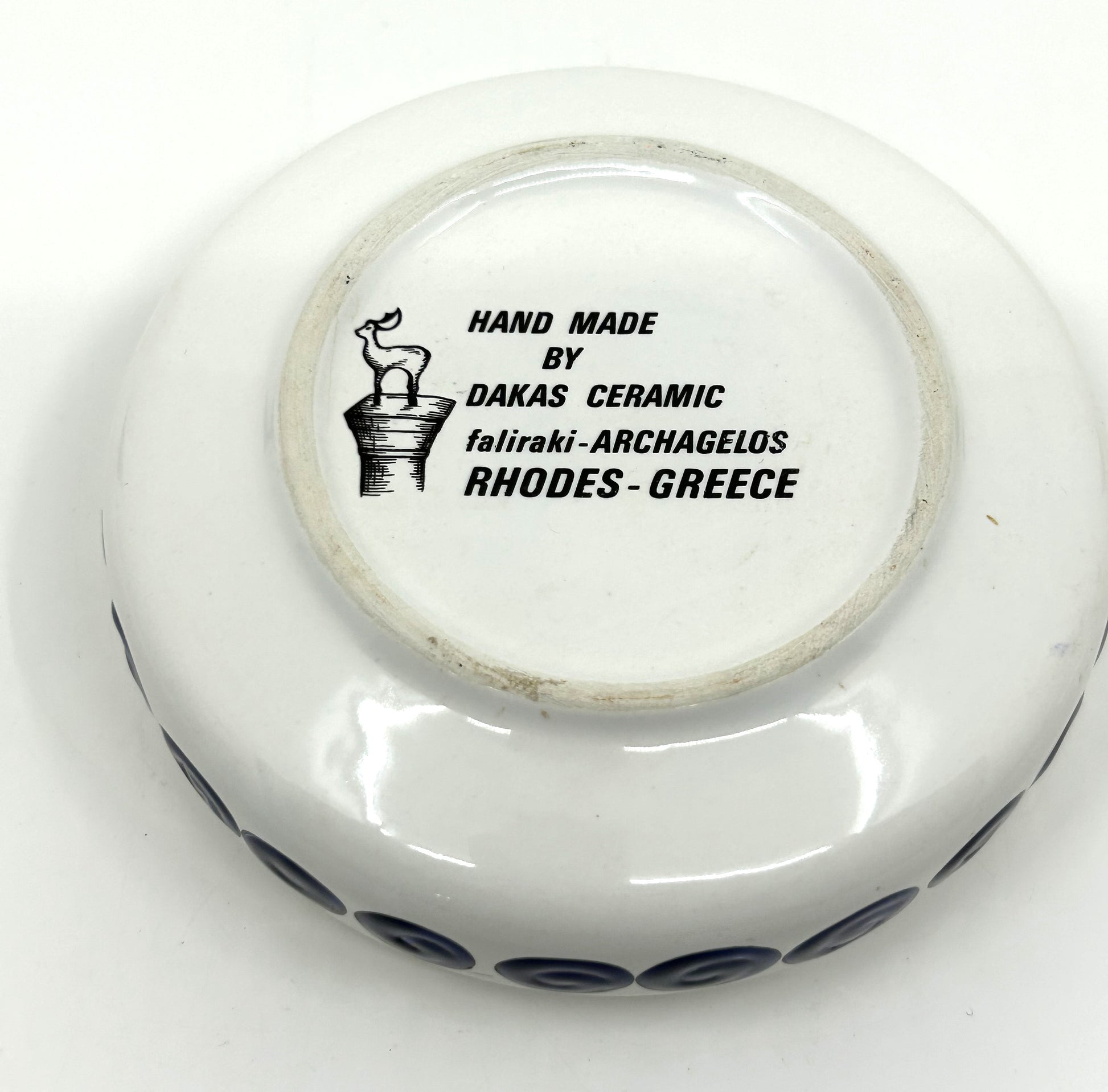 This Dakas ceramic faliraki Archagelos : made in RHODES , GREECE Blue and White floral ashtray is stunning. The multi pattern ashtray is truly eye catching. The florals, the paisley tear dropped motif circled by dark blue dots along the side and all around. If not to be used for it's intended purpose, would do well as a trinket dish, or coin catcher.