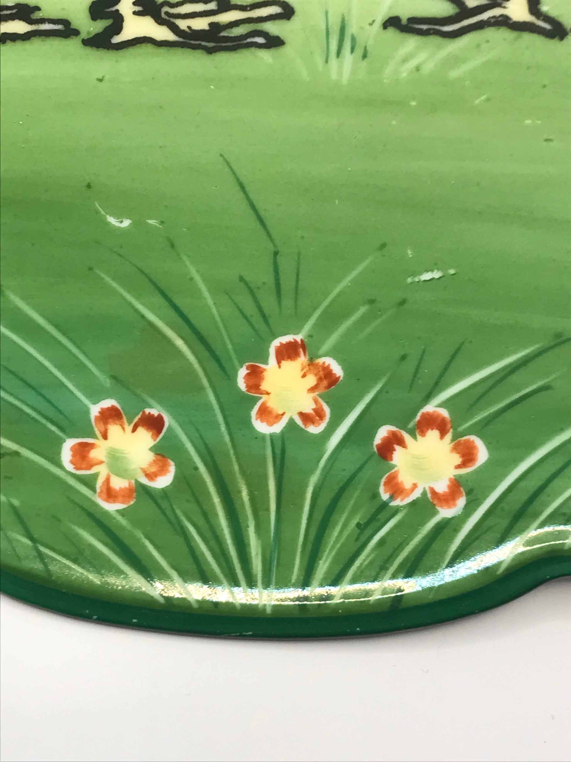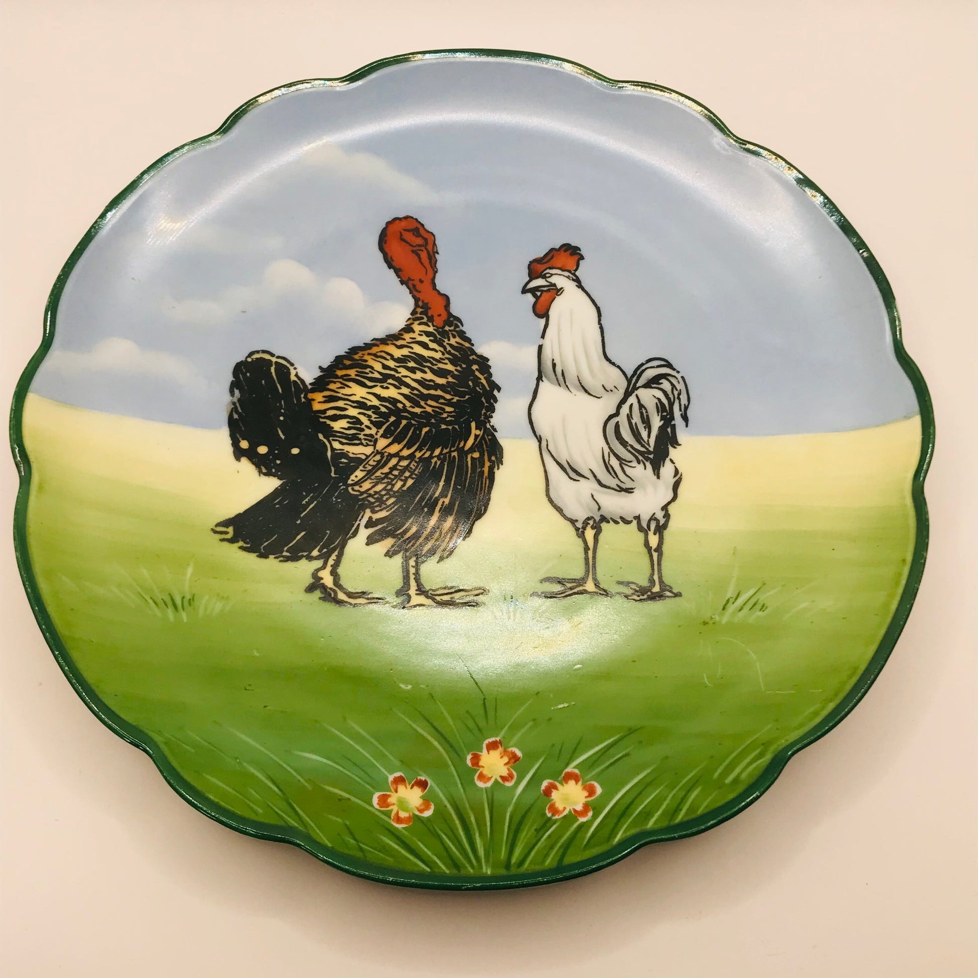 M Z MORITZ ZDEKAUER Rooster and Turkey Face Off Plate. Handpainted graphics on a porcelain base plate. Marked with the MZ MORITZ ZDEKAUER stamp. Ruffled edging.