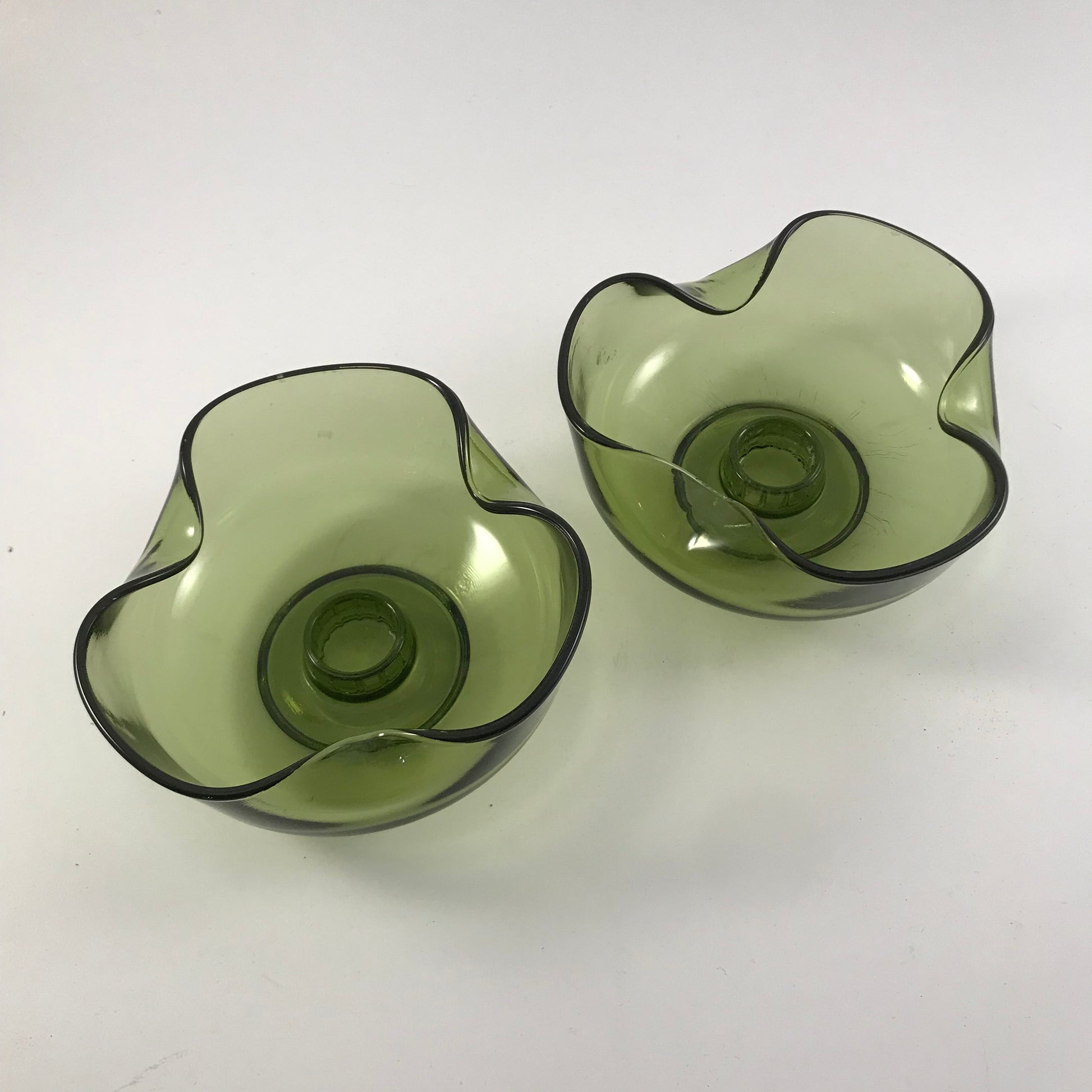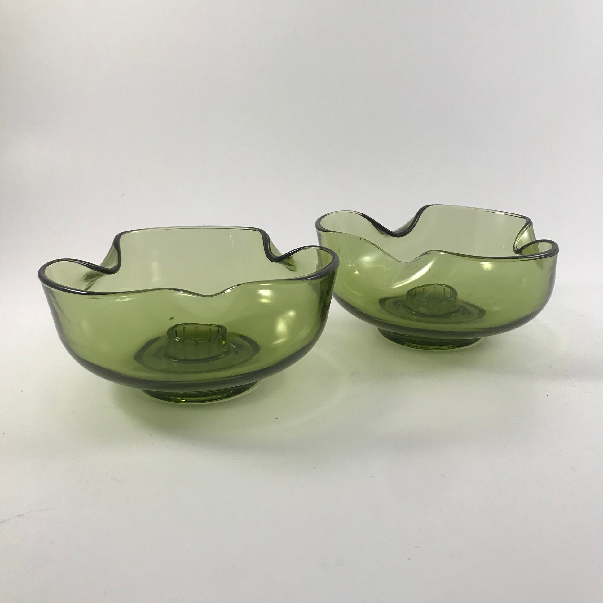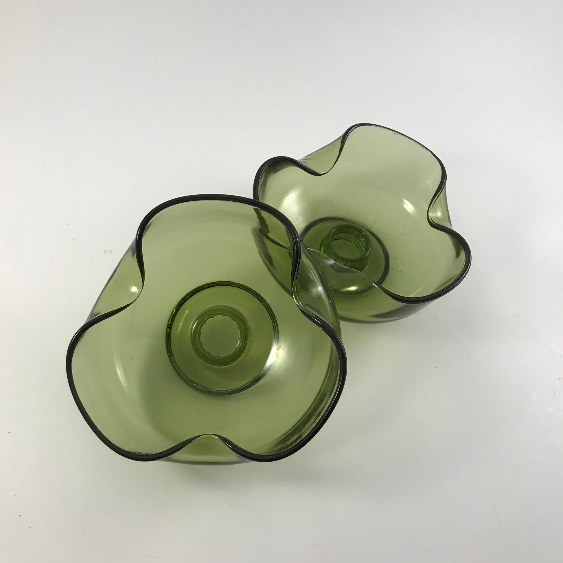Mid Century Anchor Hocking Green Pinched Glass Candle Holders Set of 2