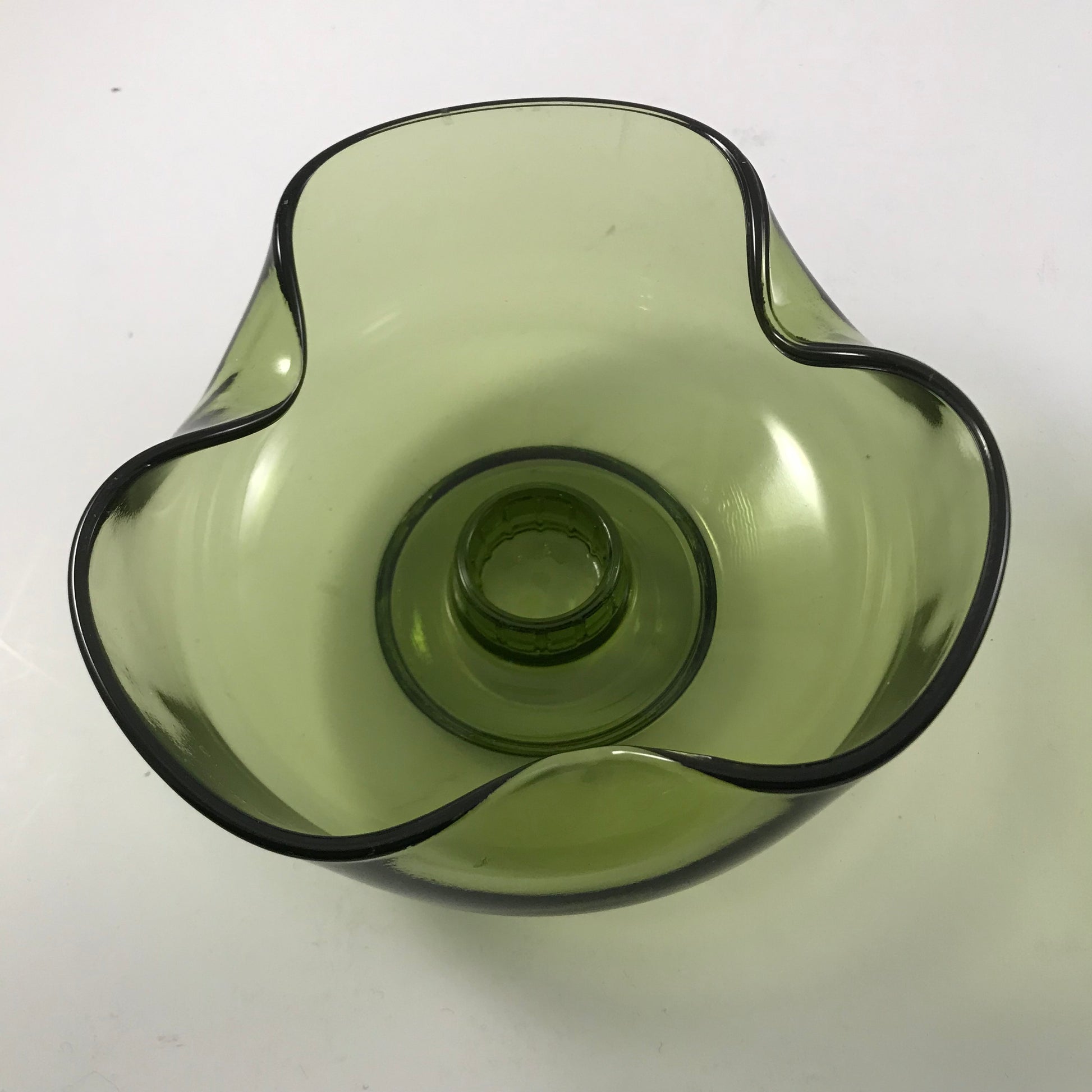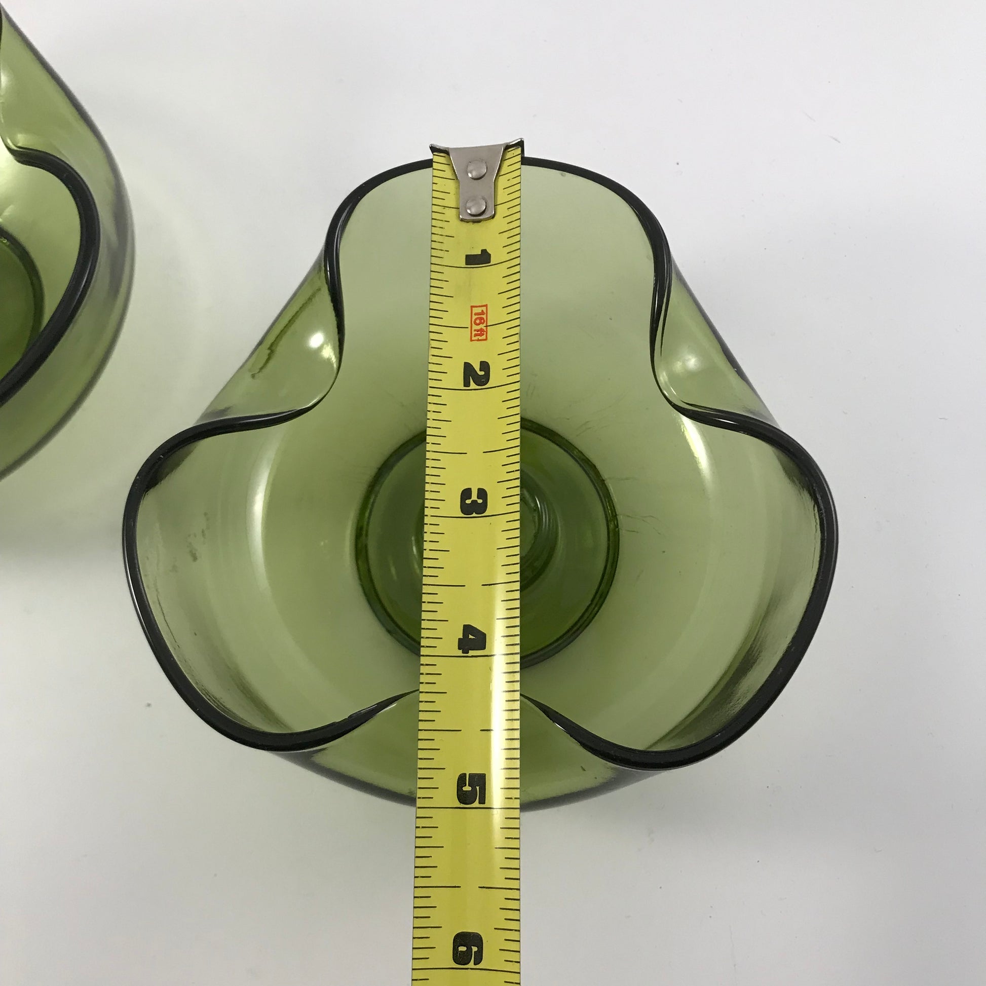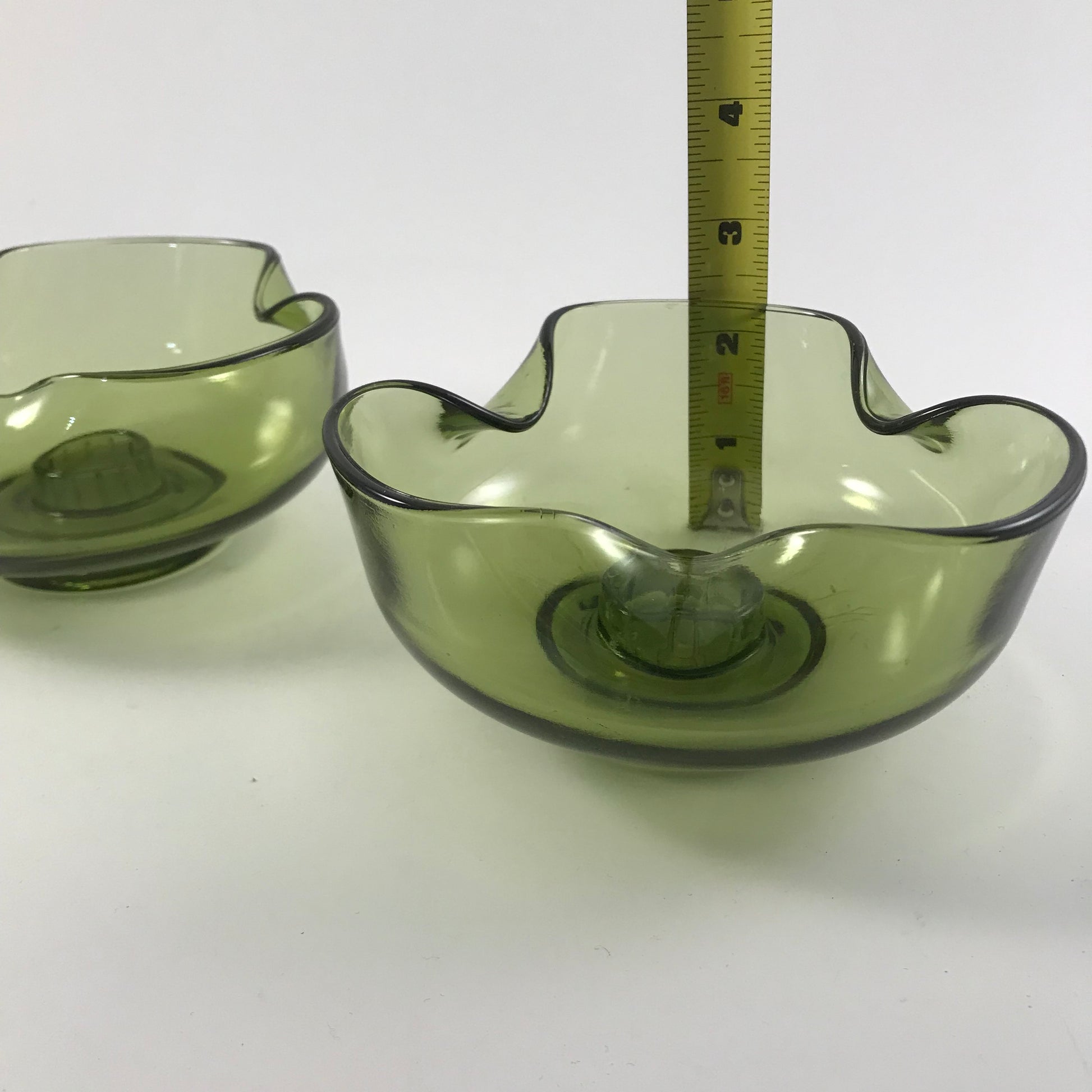 The low bowl style with the pinched edges adds a touch of class to any table decor and the green color is a classic of the time period.