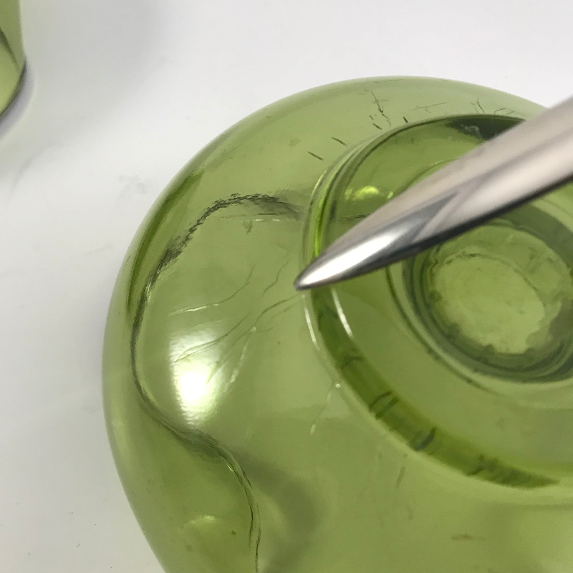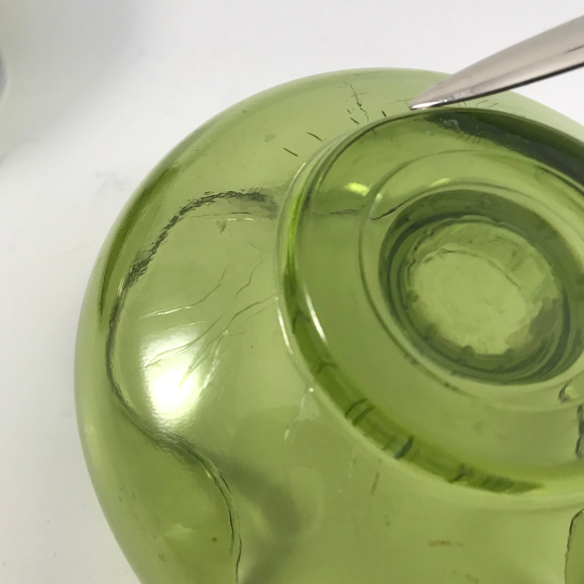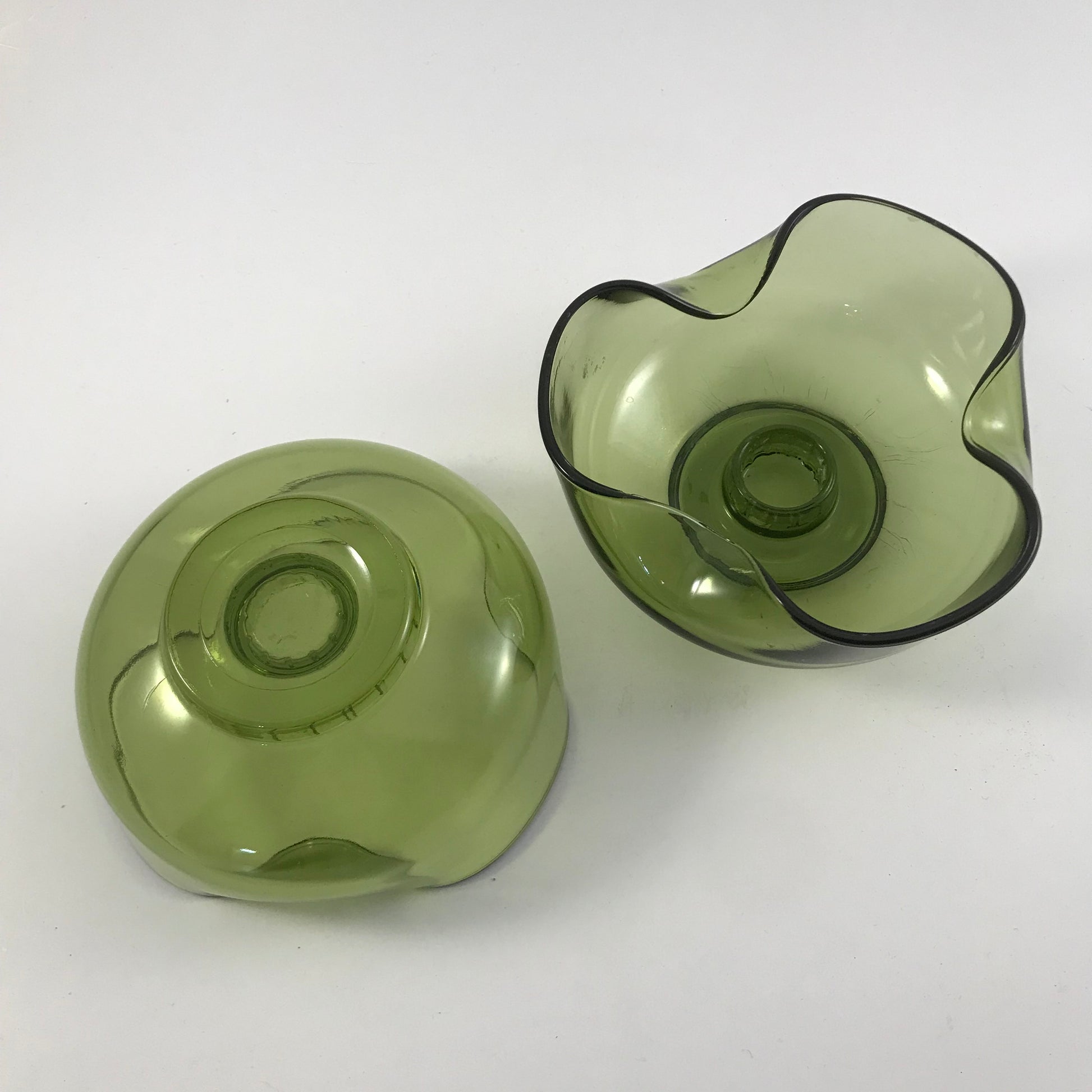 The low bowl style with the pinched edges adds a touch of class to any table decor and the green color is a classic of the time period.