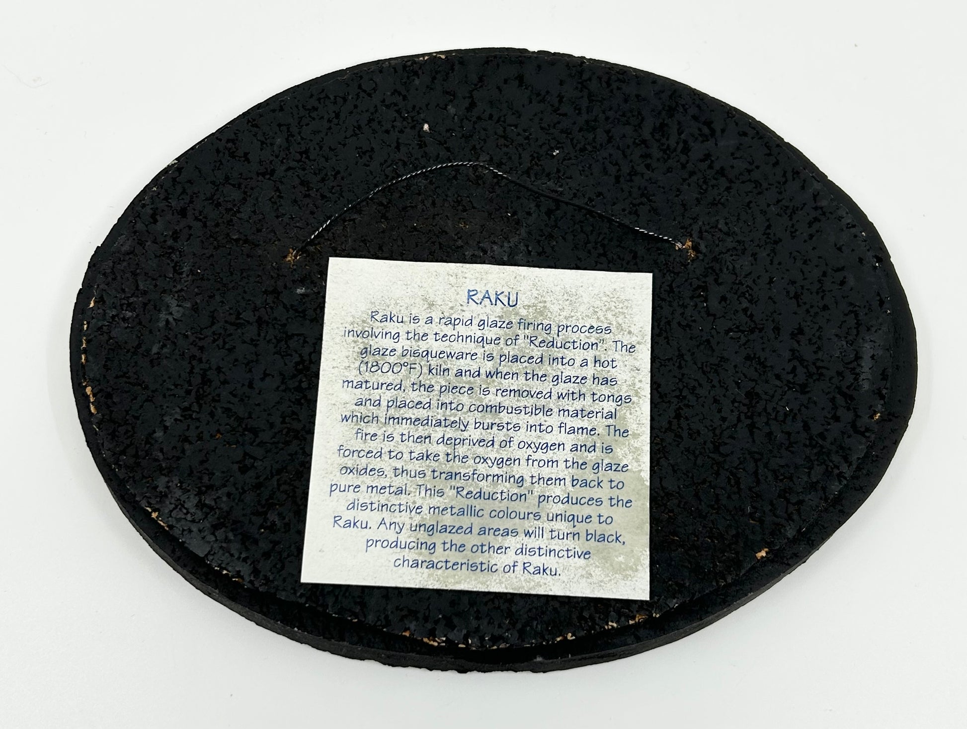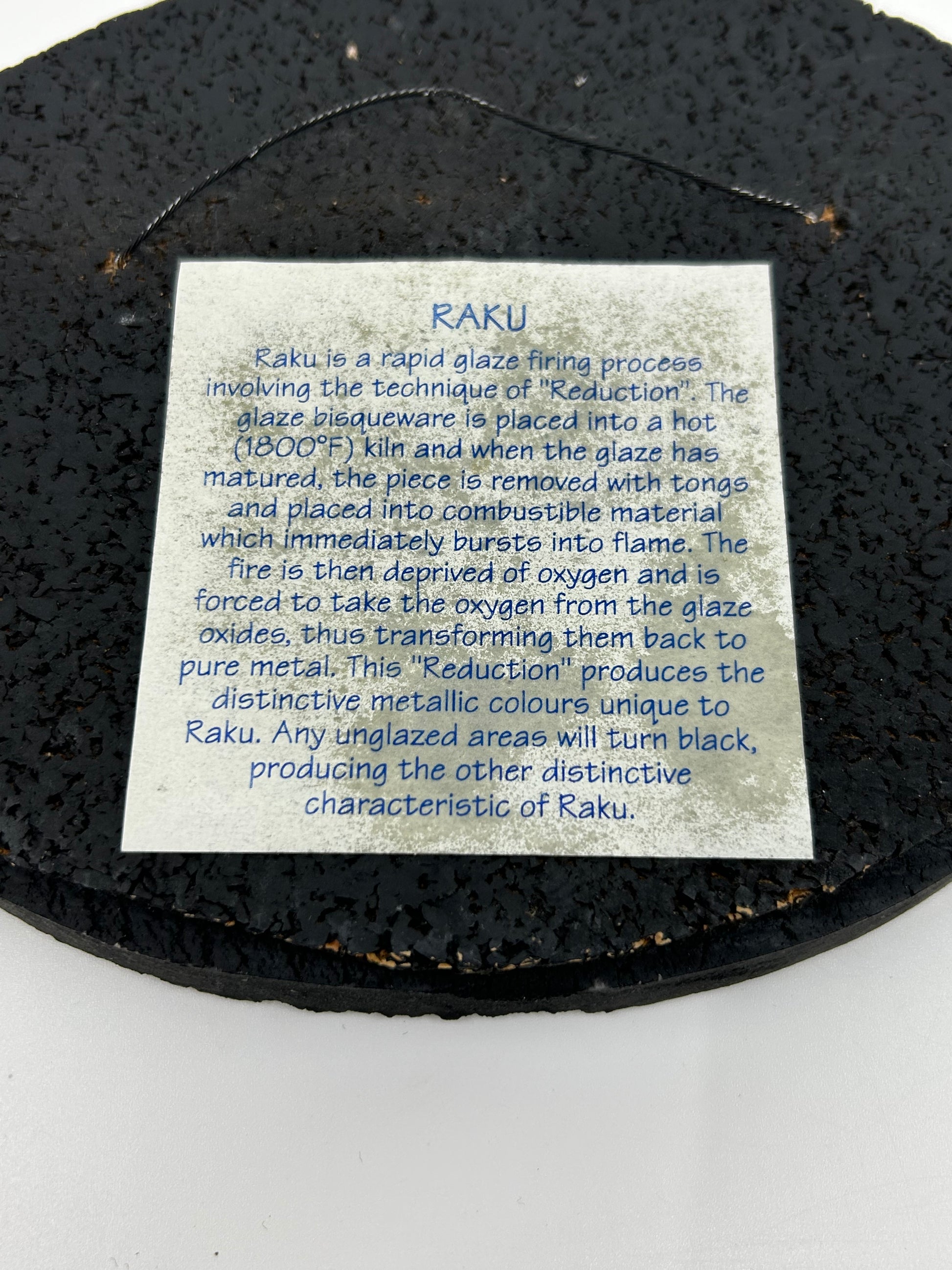 Raku pieces are always a beautiful site. This piece is no exception. The bright colors and simple details speaks for itself. Whether you hang it or place it on a stand it displays true raku finest. Bright yet subtle colors, puts the eagle in the forefront of the piece with the landscape background. Artist stamped.