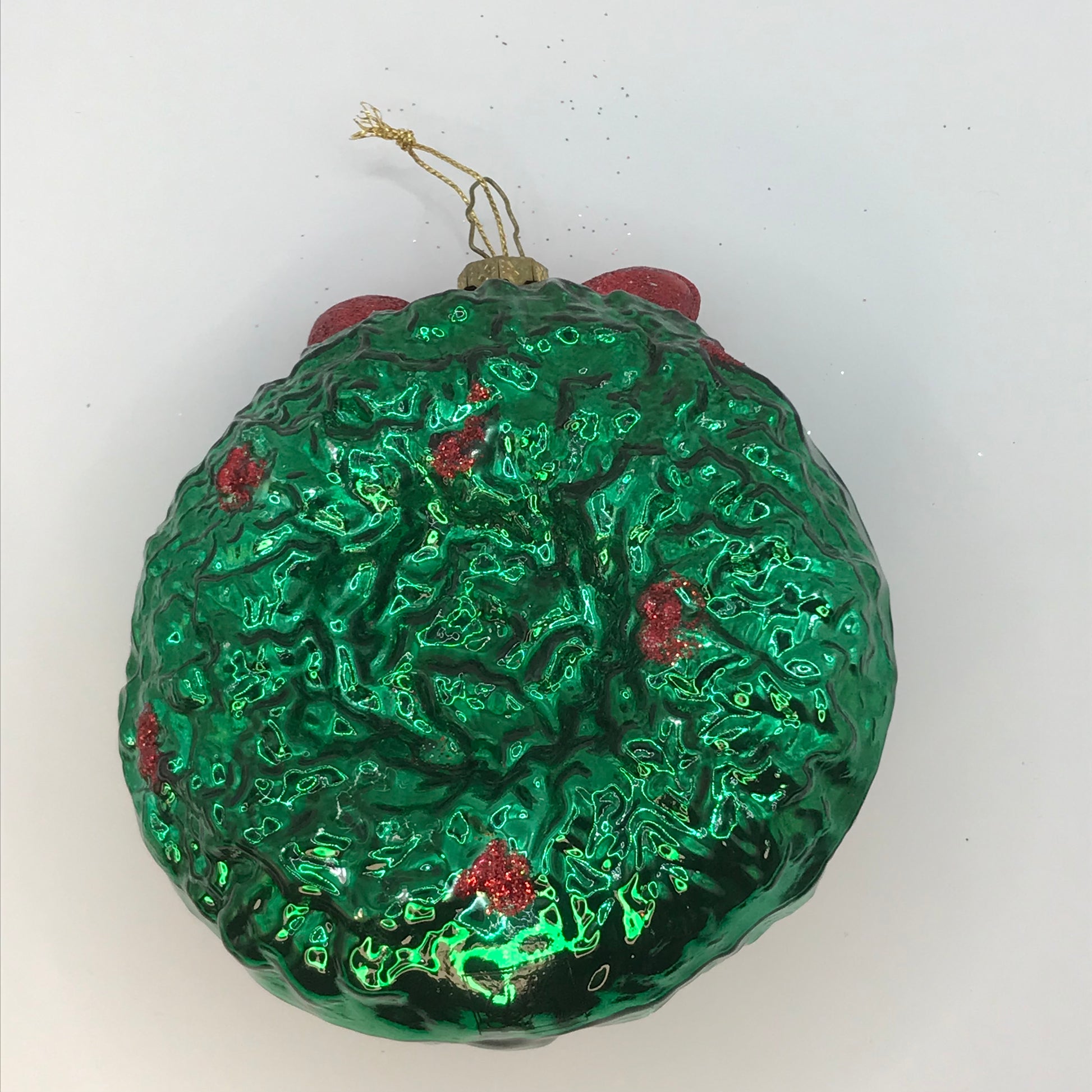 Beautifully crafted from blown glass, this ornament features Santa, a reindeer, and a festive wreath sprinkled with glitter for more drama and sparkle. Adorn your Christmas tree with this festive decoration that will bring joy to your holiday season.