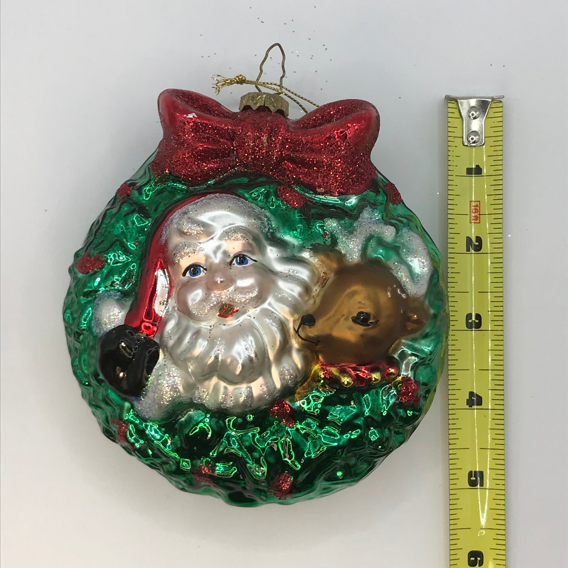 Santa Reindeer and Wreath Blown Glass Ornament
