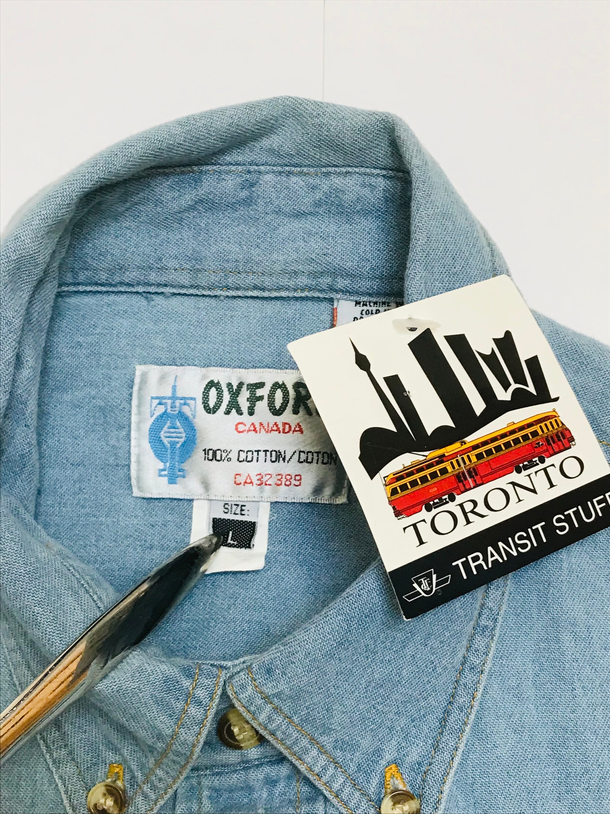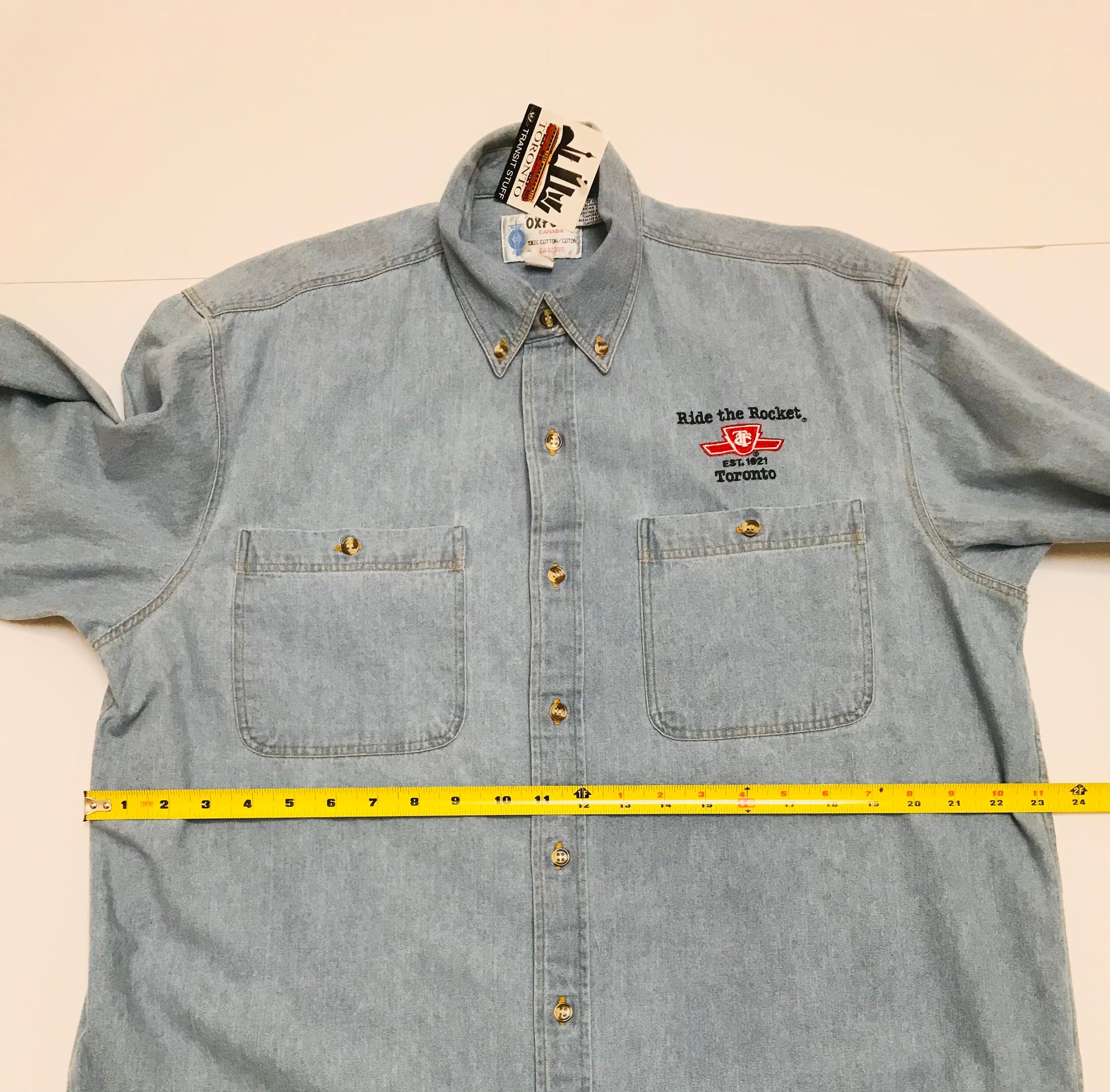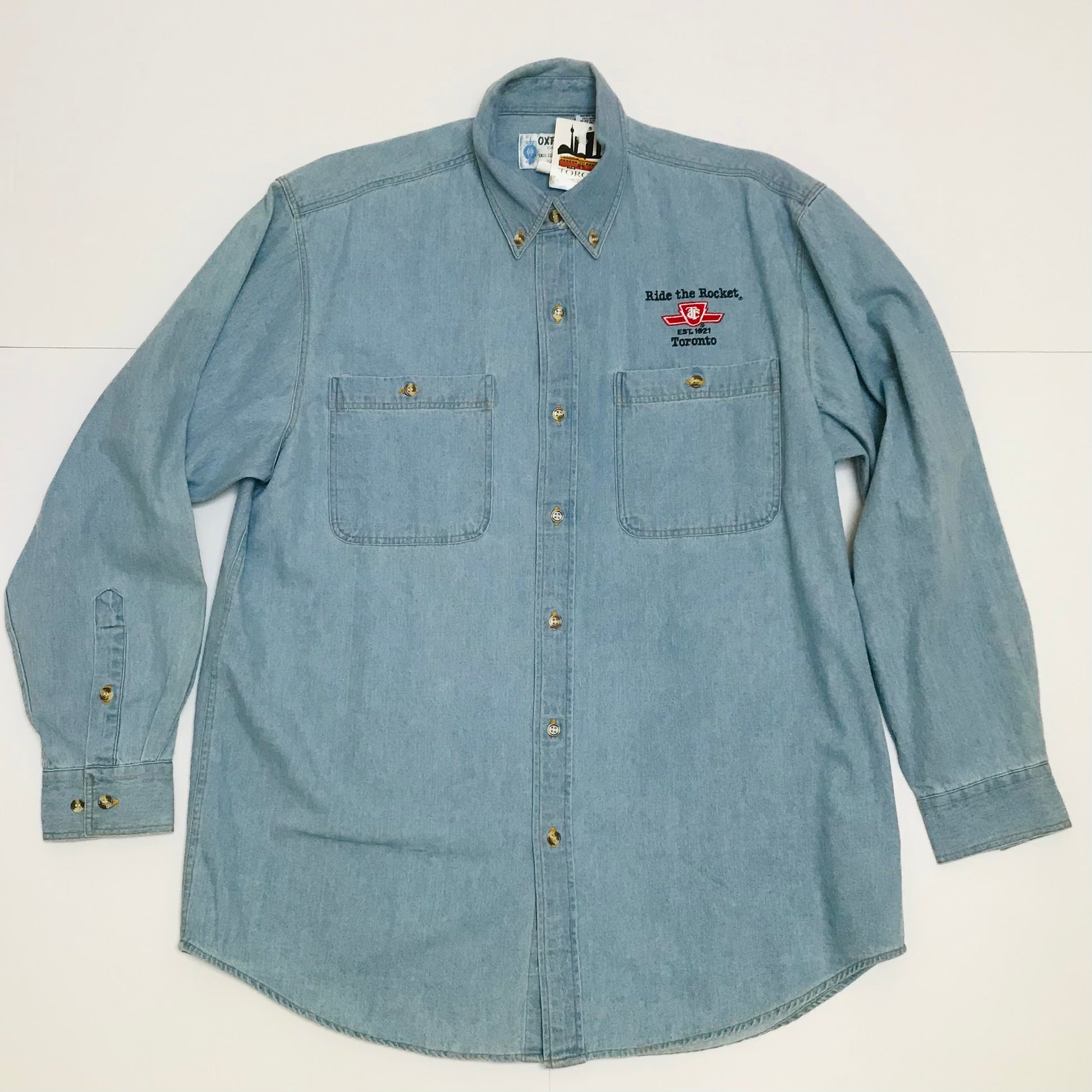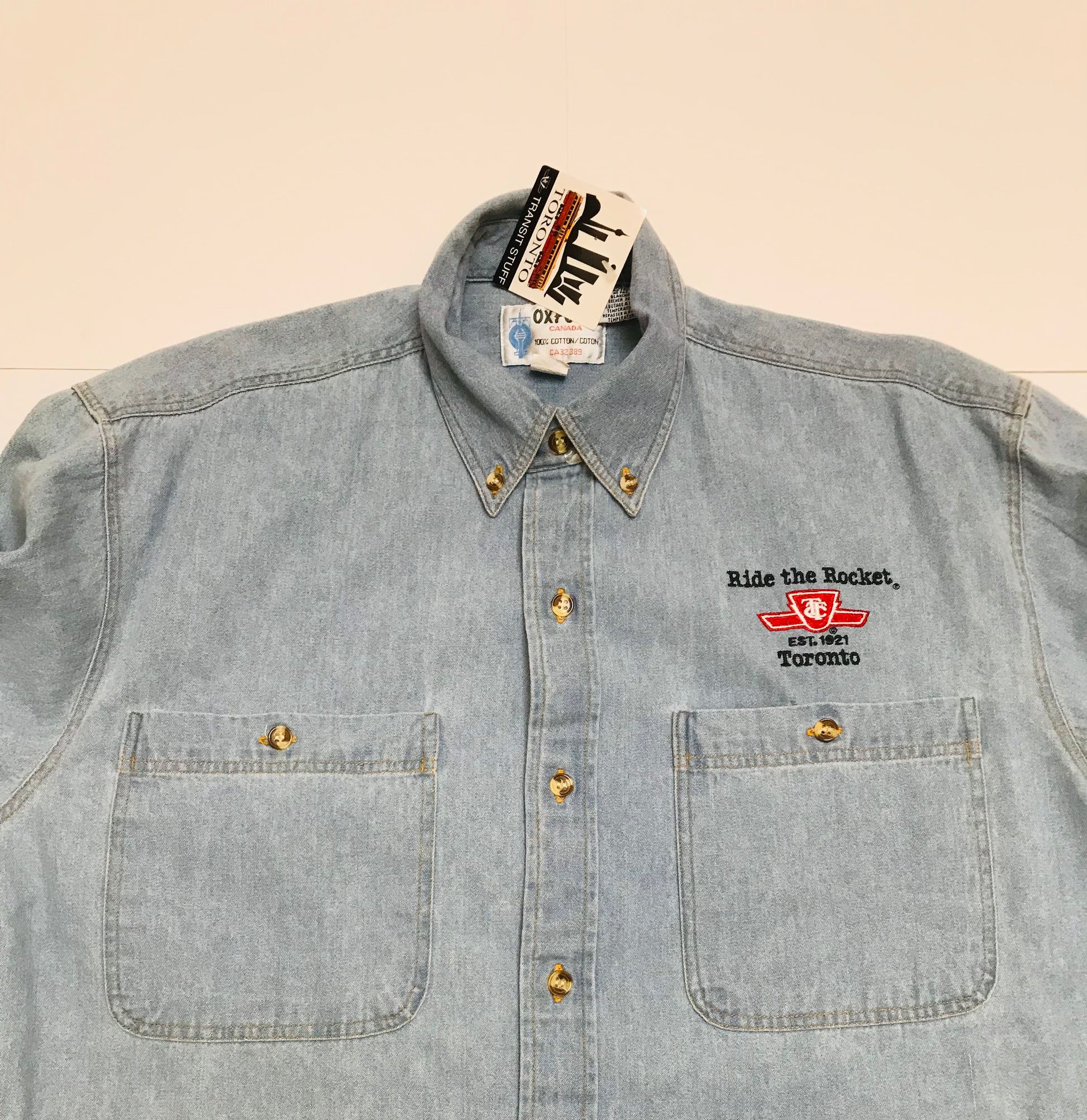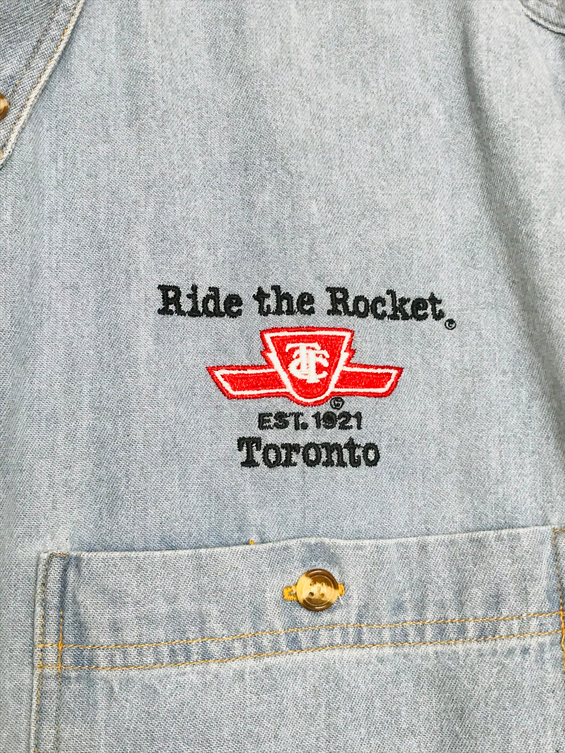 Ride the Rocket, classic TTC - Toronto Transit Corp jean long sleeve button down shirt. 100% Cotton stone washed look. Button down collar and cuff sleeves. NWT - new with tags. Made by Oxford Canada. Men's sizing L.
