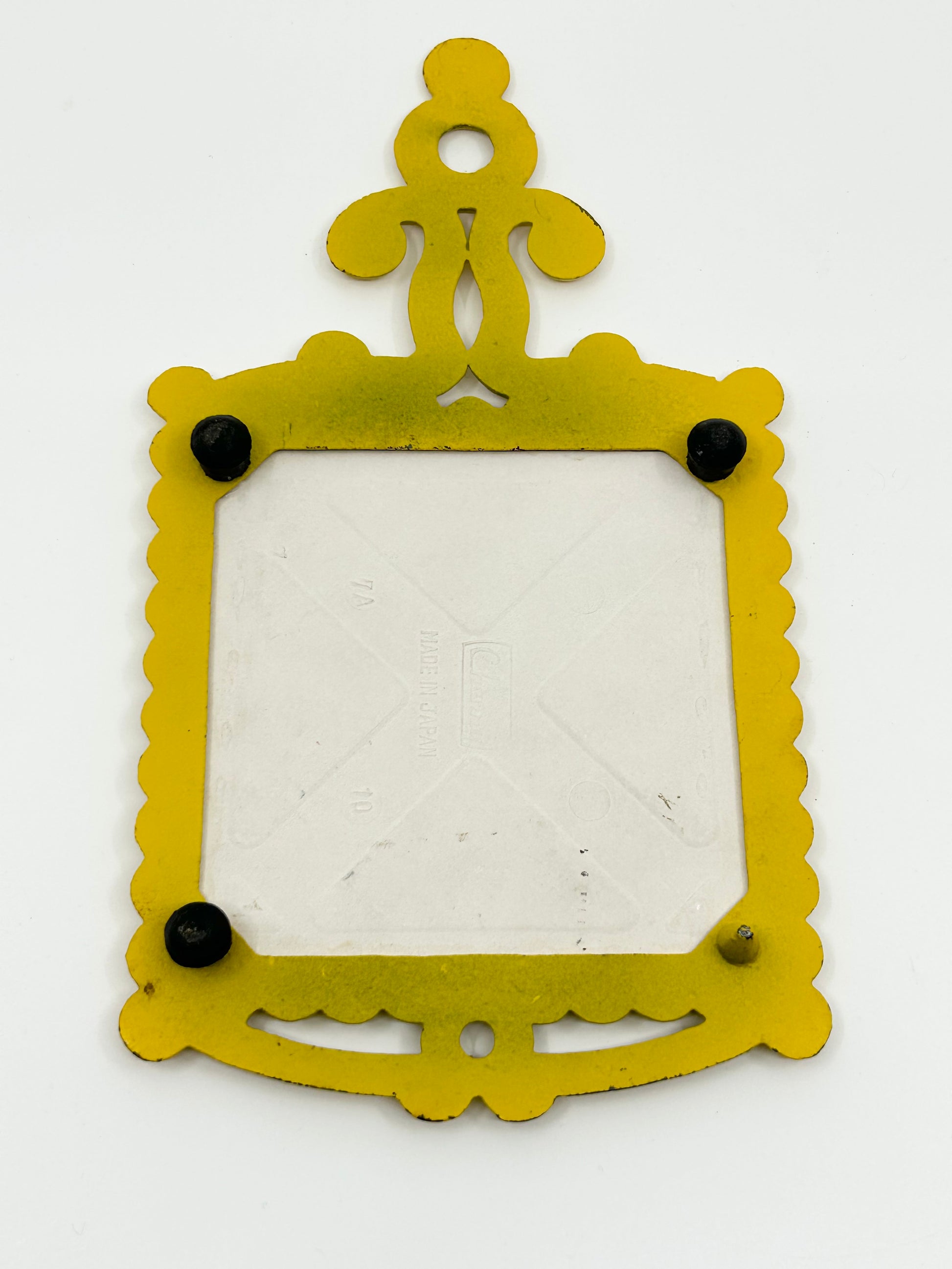 1970 is knocking on your door with this awesome mushroom print cast iron trivet. The bright yellow adds a splash of color to any kitchen. Cast iron cut out detail with a ceramic tile inlay. Oops one of the trivet feet fell off but rest assured I have it and it will be shipped complete with rubber feet on all corners. Even with age, this trivet is a vintage treasure.