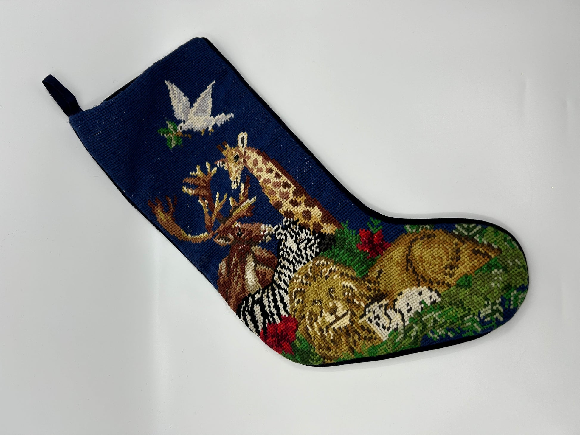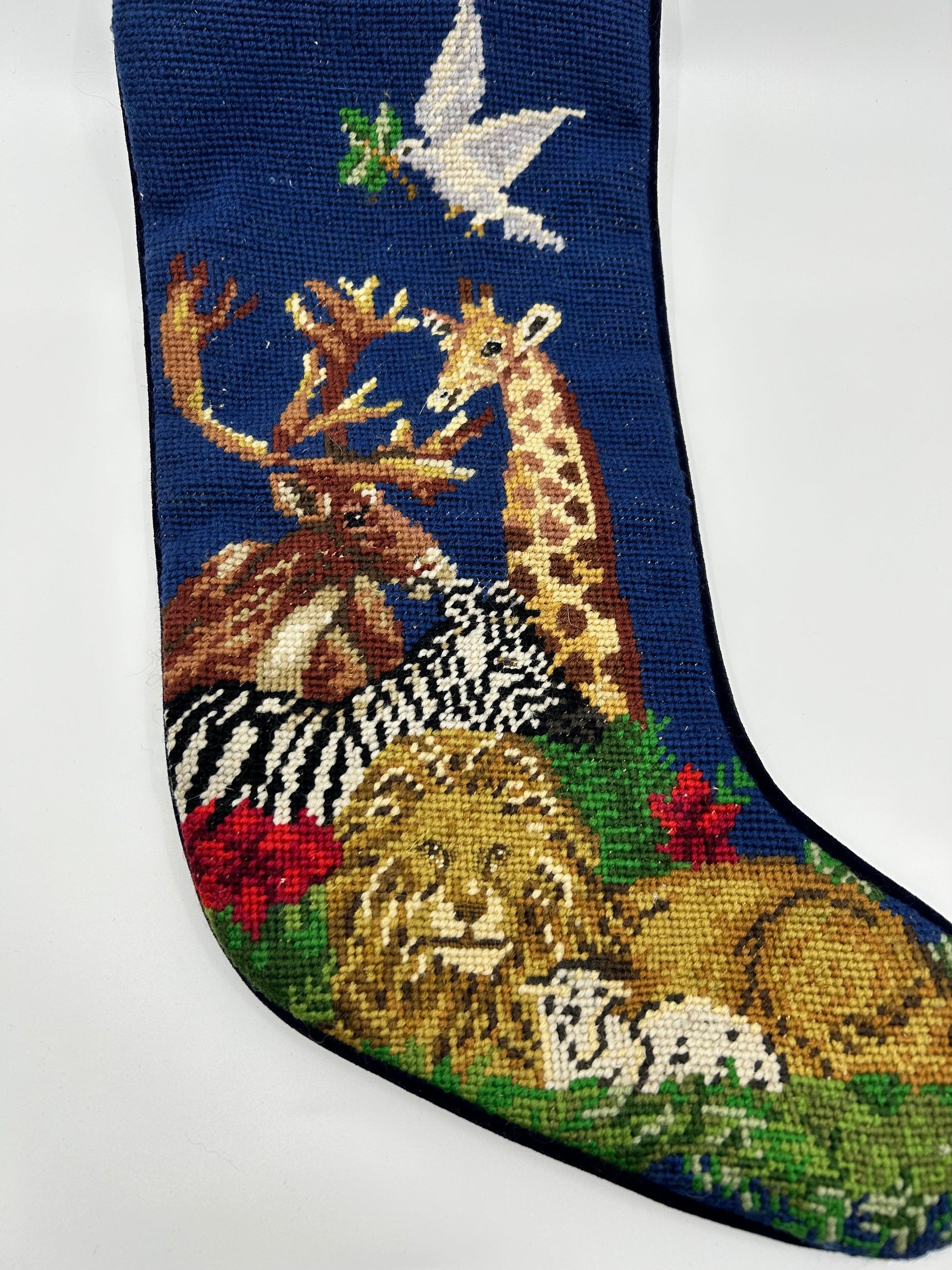 This vintage cross stitched stocking captures a lot of details of all the animals, Zebra, moose, giraffe, lion and lamb and the white peace dove topping them all. Beautiful rich colors of the animals set against a blue background.