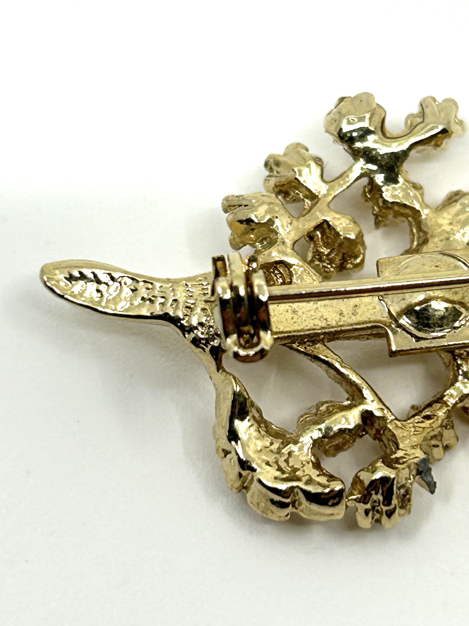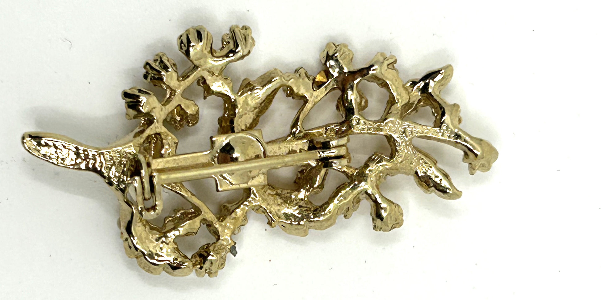 Add a touch of enchanted forest glamour with this vintage goldtone tree branch brooch, sparkling with faux diamonds and faux pearls. With its graceful, nature-inspired design, this piece brings just the right mix of rustic charm and dazzling elegance.