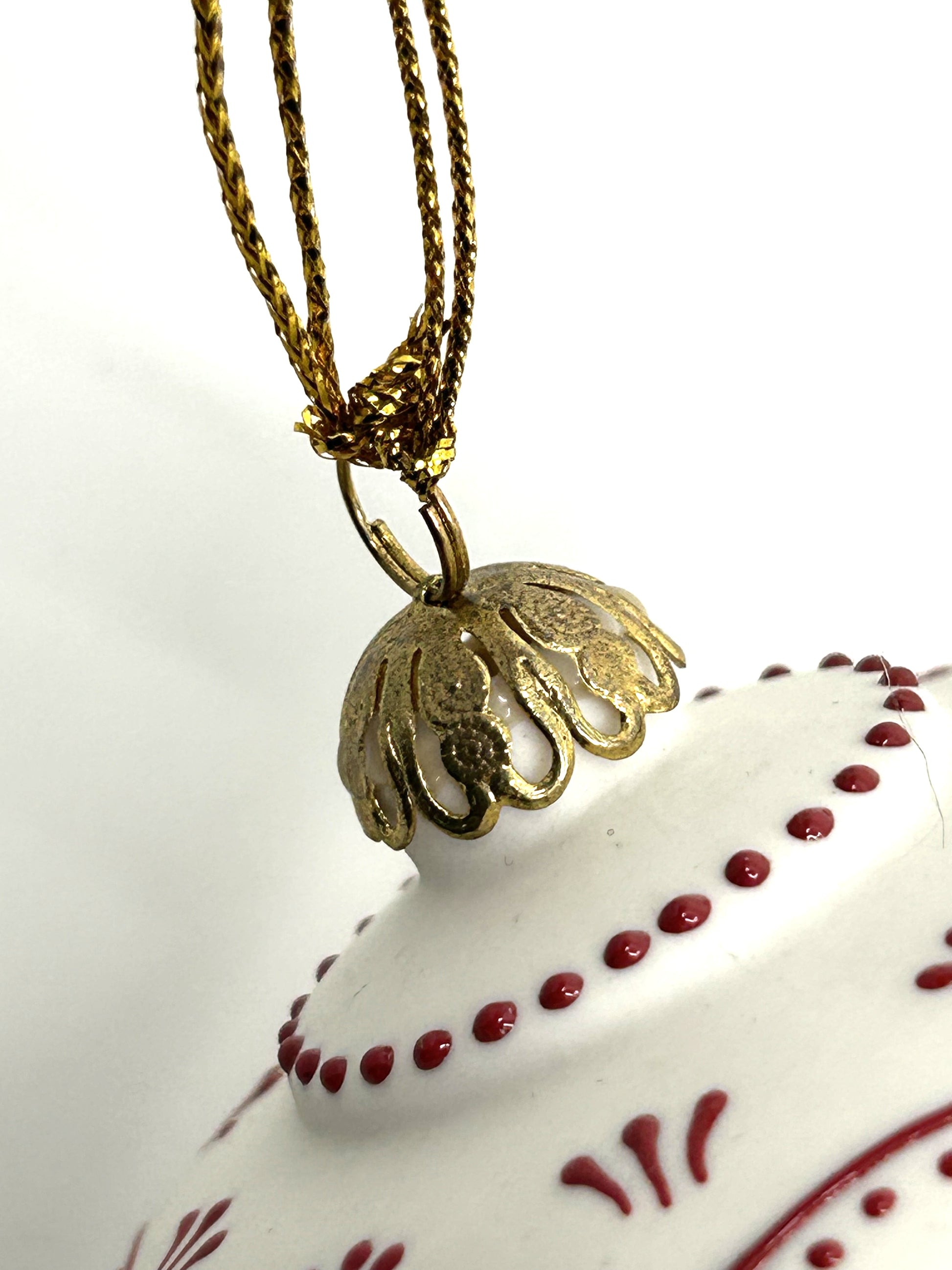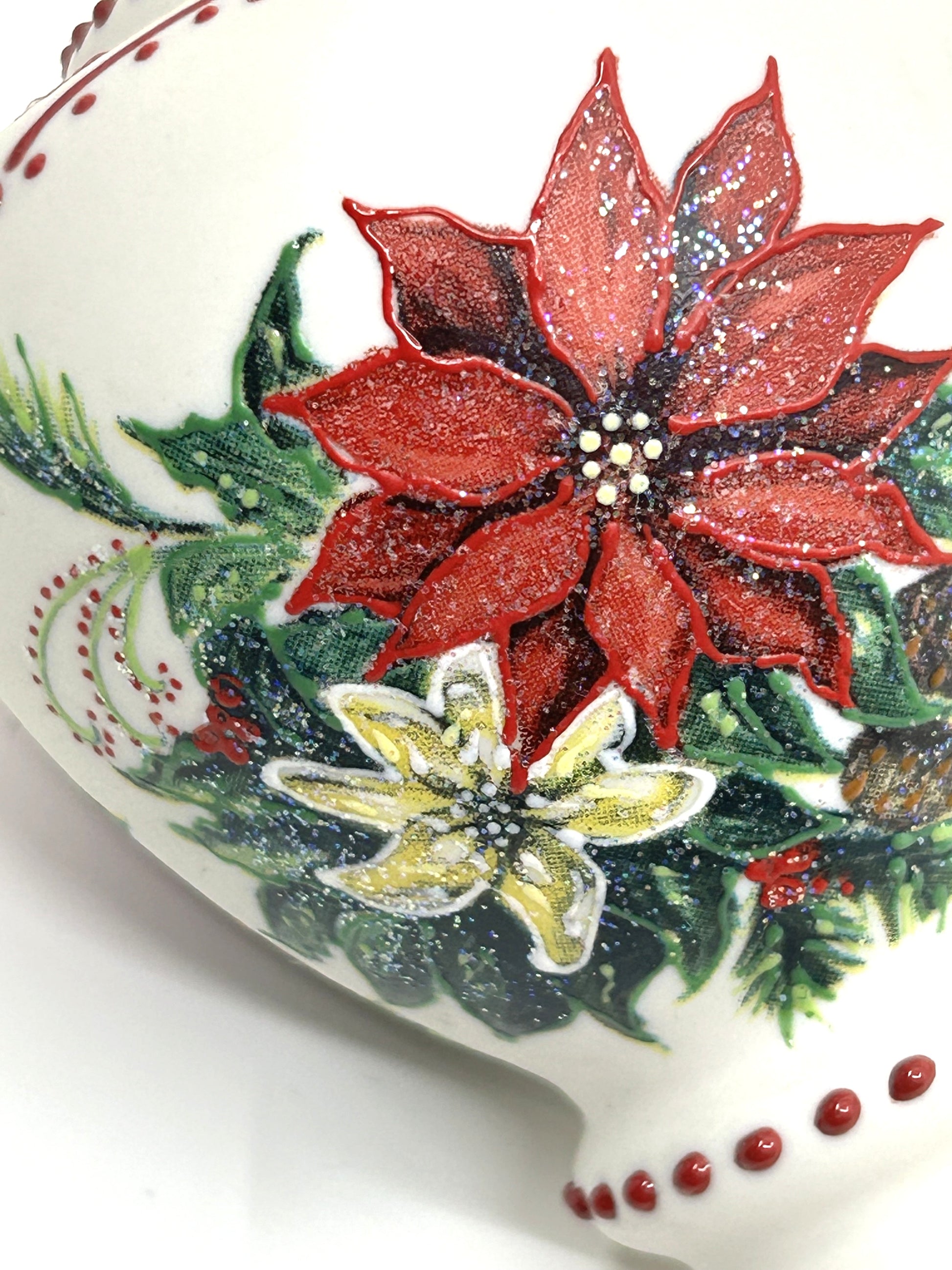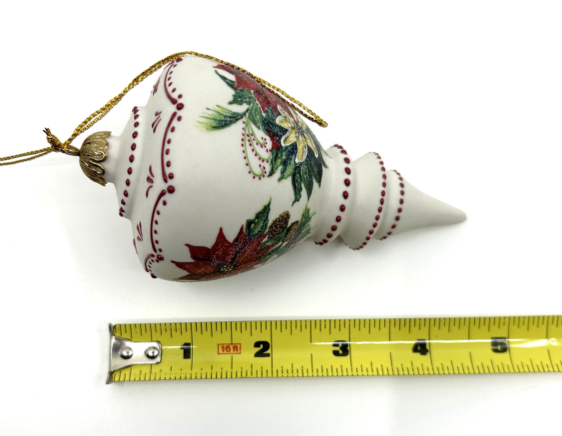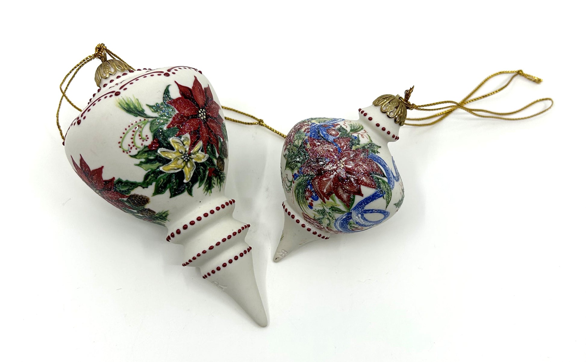 This set of 2 Rhyn Rivet porcelain hand painted finial accent Christmas ornaments are in excellent condition and would make a beautiful addition to any Christmas tree or placed in a bowl amongst other complimentary ornaments. Both are a finial shaped one smaller than the other but both have a classic look to them. Hand painted floral designs, accented with glitter, hung by a gold cap and gold hanging cord. Each ornament is embossed with the known RR initials.