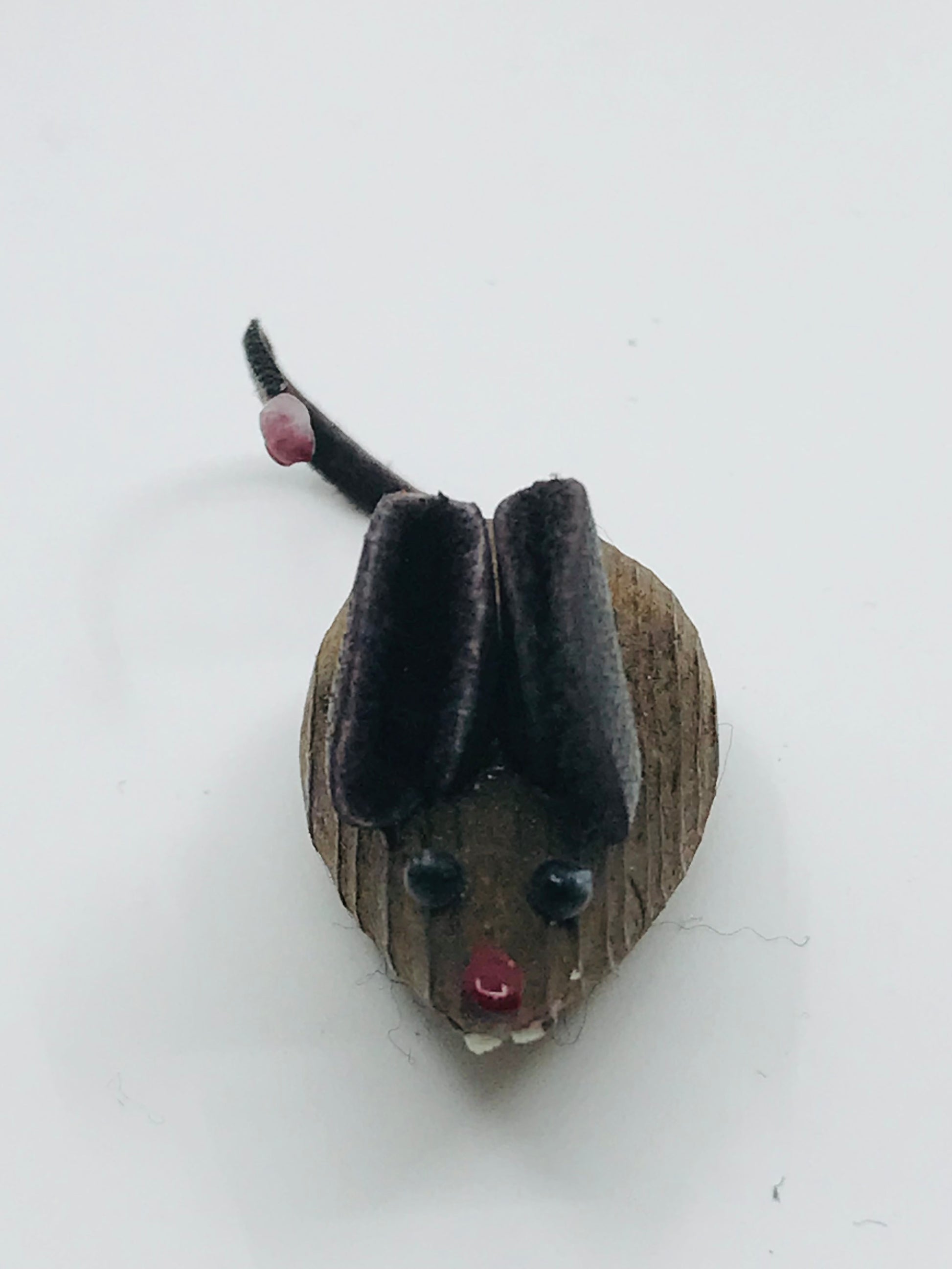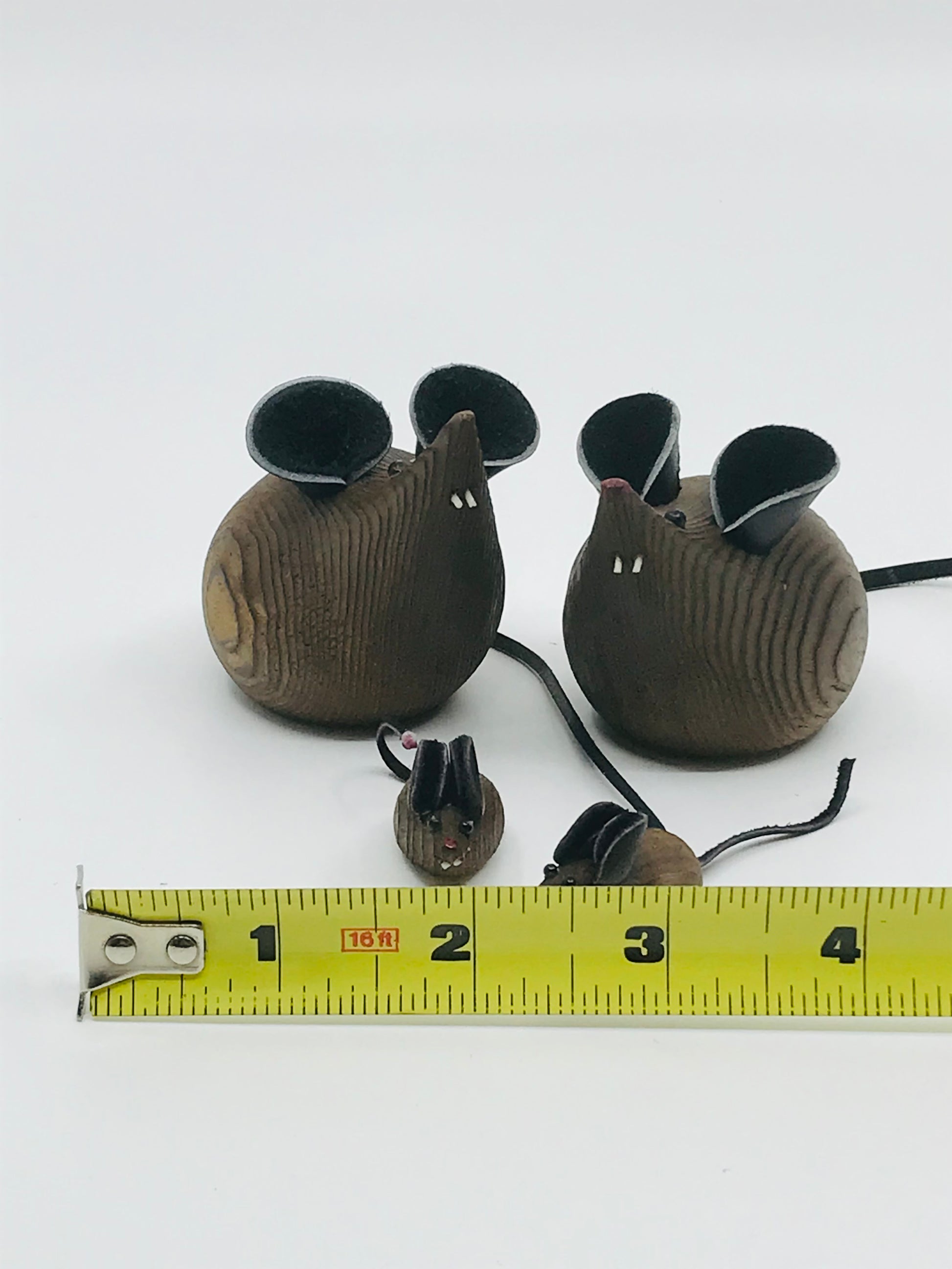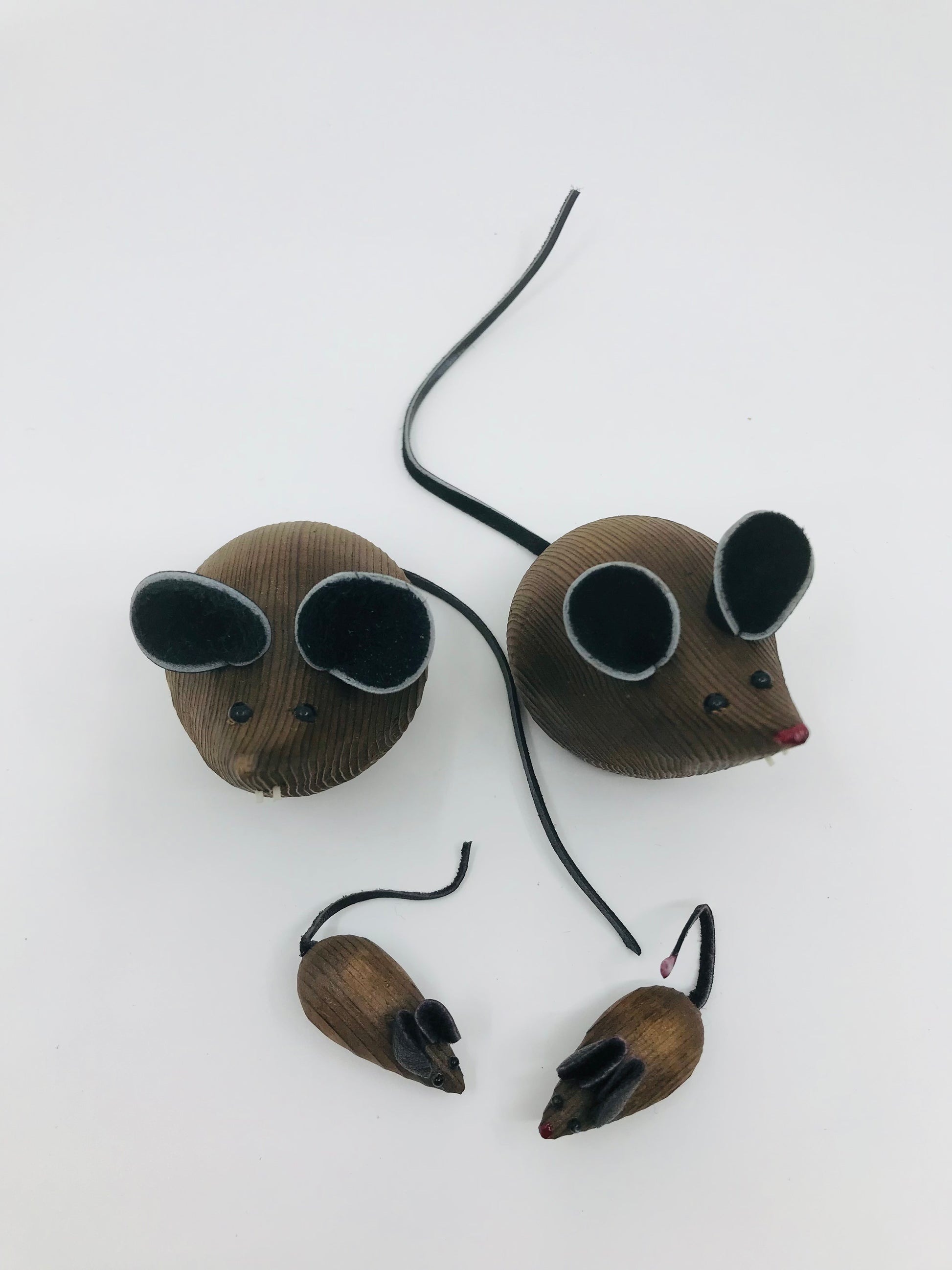 Vintage Wooden Miniature Mouse Family - Set of 4. Set includes Father, Mother, Son and daughter mice. Carved of wood with leather ears and tail and white buck teeth. Mom and daughter sport a red nose.